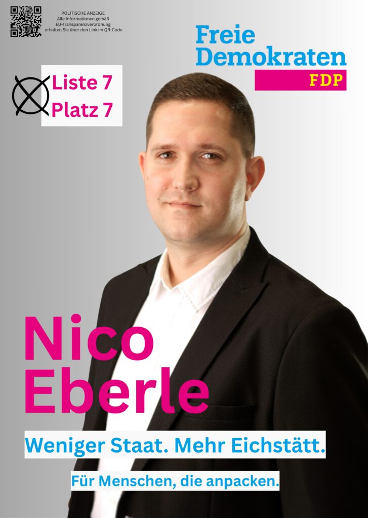 Die FDP ist auch hier im Landkreis wählbar! Unser Kreisvorsitzender Nico Eberle tritt an. Zusammen mit unseren Freunden von den Jungen Freien Wählern Kreisvereinigung Eichstätt wollen wir Zukunft schaffen, wo andere schon den Untergang ausmalen. Deshalb am 08. März 2026: Stimme abgeben und Zukunft wählen!